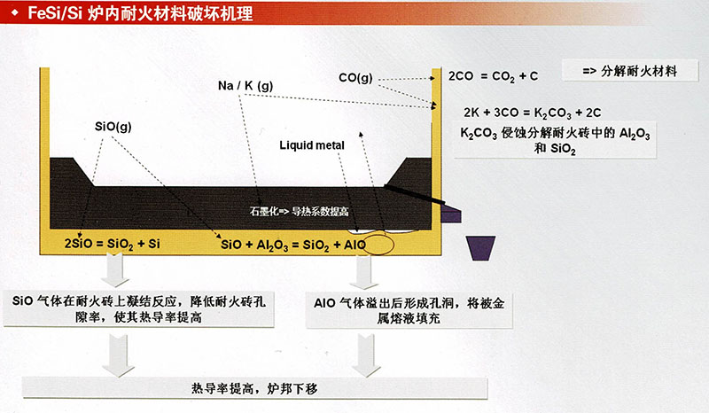 因為在FeSi、Si及電石和生產(chǎn)所用的材料中都含有一定量的堿,生產(chǎn)過程中堿會降低,同時會形成一定壓力的堿性氣體,堿性氣體向下滲透到炭質(zhì)爐襯會使炭質(zhì)爐襯石墨化,由于炭質(zhì)爐襯在石墨化會急劇的使其導(dǎo)熱系數(shù)增加。因而造成炭質(zhì)爐襯材料下面的材料完全暴露在1700-1800℃的高溫下,這遠遠高于常規(guī)耐火材料最大工作溫度。從反映坩堝滲透下來的CO氣體在這種溫度下將和耐火材料當中的AI2O3發(fā)生還原反應(yīng)形成AIO,AIO氣體將上升逐漸的耐火材料這里會形成空洞。然而SiC糊料將不會受來自于反應(yīng)區(qū)氣體的侵蝕,所以也不會被破壞或形成空洞。